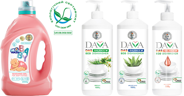 Гель для прання Doctor WASH BABY та 3 найменування засобів для миття посуду DAVA das BALANCE виробництва ТОВ «СУНП «2К» успішно пройшли повторну екологічну сертифікацію за схемою згідно з ДСТУ ISO 14024 (сертифікат №UA.08.002.502).