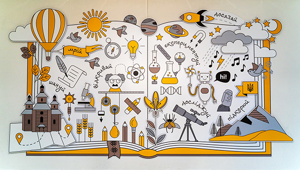 У дизайні також уникали традиційного оздоблення – замість суворих обличь літніх корифеїв науки на світлих стінах розміщено привітні інфографіки і тематичні панно, як наприклад, дерев’яні та коркові карти в кабінеті географії.