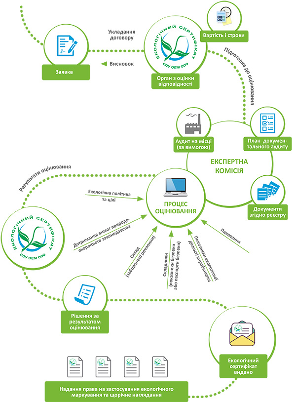 Схема оцінювання товарів і послуг (сертифікації) відповідає вимогам ISO 14024 і передбачає наступний алгоритм дій.