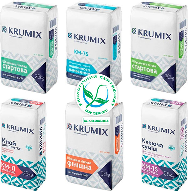 У складі екологічно сертифікованих сухих будівельних сумішей ТМ «КРУМІКС» («KRUMIX») відсутні складники з вмістом летких органічних сполук (ЛОС), азбесту, фосфогіпсу, формальдегіду, органічних сполук олова, галогенованих органічних зв’язуючих компонентів, галогенованих органічних антипіренів, ароматичних розчинників, фталатів з алкильними групами (метил-, етил-, пропил, бутил або октил). Видобуток гіпсу на основі якого виробляються суміші ТМ «КРУМІКС» («KRUMIX») здійснюється безпосередньо ПрАТ «Івано-Франківськцемент» з Межигірсько – Маринопільського родовища у Івано-Франківській області.