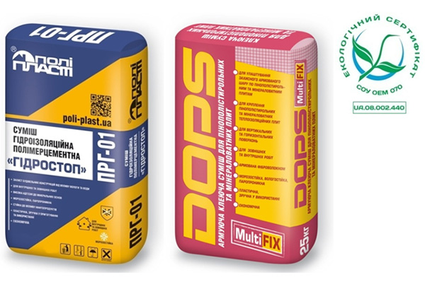 Суміш гідроізоляційна полімерцементна «Гідростоп» ПРГ-01 ТМ «ПОЛІПЛАСТ» та армуюча клейова суміш для пінополістирольних та мінераловатних плит «DOPS MULTIFIX» виробництва ТОВ «Виробнича компанія «Поліпласт» успішно пройшли екологічну сертифікацію згідно ISO 14024 та отримали екологічний сертифікат №UA.08.002.440.