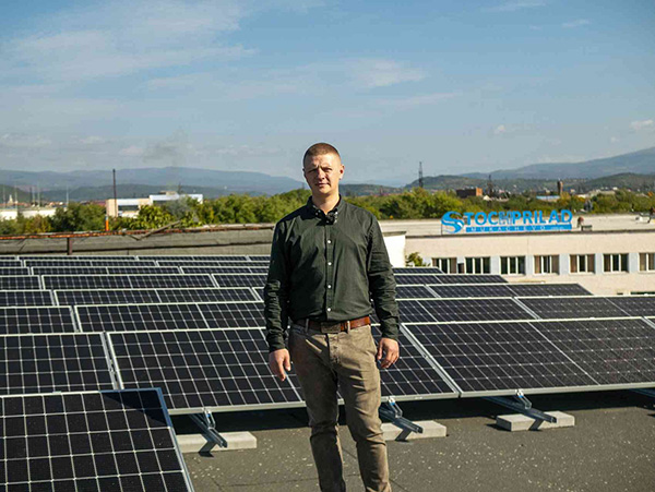 Один з засновників ПРАЙМ СНЕК, Пилип Гришин, на даху виробництва, обладнаного сонячними панелями
