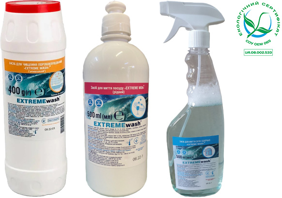 16 найменувань мийних та чистячих засобів «EXTREME WASH» виробництва ТОВ «Гренландія НВП» додалися до асортименту екологічно сертифікованої продукції (сертифікат №UA.08.002.533).