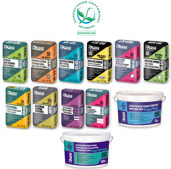 ТОВ «Виробнича компанія «Поліпласт» розширила асортимент екологічно сертифікованих сумішей будівельних сухих 41 найменуванням. До сертифікованих у 2016 році суміші гідроізоляційної полімерцементної «Гідростоп» ПРГ-01 ТМ «ПОЛІПЛАСТ» та армуючої клейової суміші для пінополістирольних та мінераловатних плит «DOPS MULTIFIX» (екологічний сертифікат №UA.08.002.440) додані такі продукти ТМ «ПОЛІПЛАСТ»: