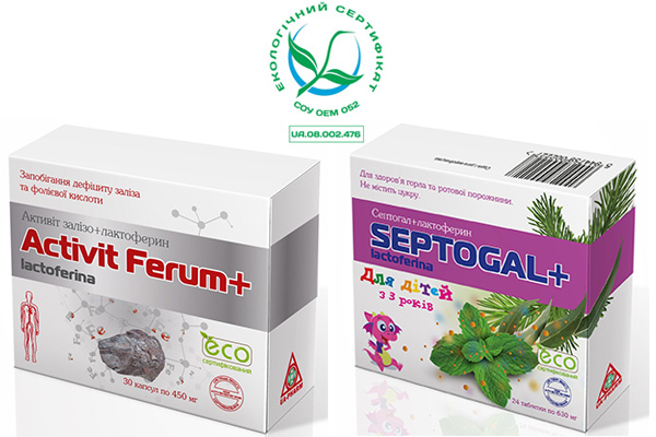 ТОВ «ЮА-ФАРМ» розширило асортимент екологічно сертифікованих дієтичних добавок згідно екологічного сертифікату №UA.08.002.476 на 2 найменування: «Септогал джуніор / СЕПТОГАЛ+ для дітей» та «Активіт Залізо з лактоферином».