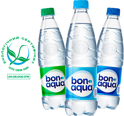 Вода природна питна «БонАква» (сильно газована, середньо газована, негазована) виробництва ІП «Кока-Кола Беверіджиз Україна» успішно пройшла повторну екологічну сертифікацію за схемою згідно ISO 14024 й таким чином термін дії екологічного сертифікату №UA.08.002.376 подовжено на 3 наступних роки.