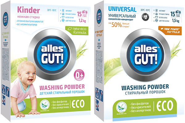 Относительно состояния здоровья - продукция TM “Alles GUT!” не содержит токсических веществ по фазам риска для здоровья человека в соответствии с европейскими нормами. Состав моющих средств на более чем 80% состоит из натуральных (олеохимических) веществ, что обуславливает минимальный уровень общей токсичности в соответствии с требованиями экологических критериев. Также в составе моющих средств TM “Alles GUT!” отсутствуют ароматизаторы, содержащие аллергены, летучие органические соединения (точка кипения которых не менее 150 0С), фосфорсодержащие соединения (в т.ч. фосфаты, фосфонаты), цеолиты.