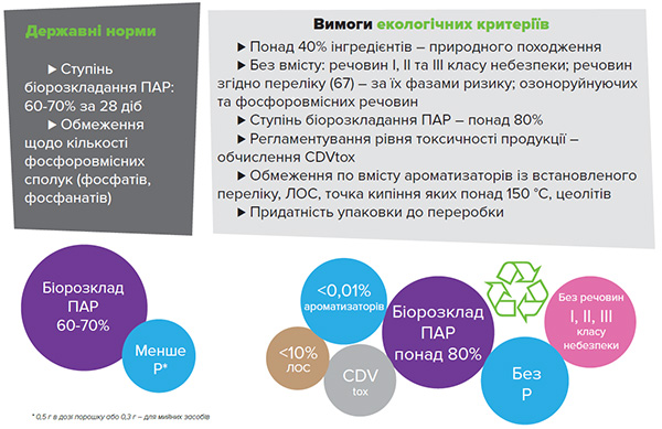 В процессе оценки эксперт должен руководствоваться исключительно требованием стандарта. В экологических критериях на моющие средства ограничено применение 168 химических веществ по уровню токсичности и биологическому разложению, запрещено применение 289 веществ по фазам риска для окружающей среды и здоровья человека, а также 26 ароматических веществ, содержащих аллергены. Причем все это – сверх украинских государственных норм. Что собственно и определяет улучшенные показатели качества и безопасности эко продукта.